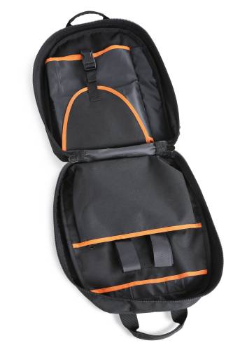 Double poignée sur la partie supérieure centrale du sac à dos pour une prise sûre et équilibrée. Deux grandes poches frontales. Deux grandes poches intérieures et deux bandes velcro supplémentaires. Trousse pratique enroulable composée de 4 panneaux porte-outils. Bretelles renforcées réglables. Charge maxi 15kg. Livré sans outils.
