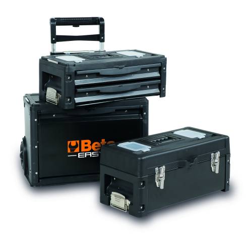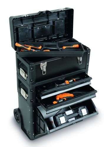 Chariot porte-outils à trois modules superposables avec roues de Ø 128mm. Structure en tôle d'acier et matière plastique. 3 modules séparables : 1 coffre supérieur, hauteur 222 mm, 1 module central, hauteur 168 mm, avec 2 tiroirs, hauteur 60 mm et 1 module inférieur, hauteur 332 mm, avec porte basculante, hauteur 280 mm, avec roues. Poignée télescopique réglable en 4 positions. Système de décrochage des modules avec accès aux différents compartiments porte-outils. Panier supérieur avec plateau porte-objets interne et 2 porte-outils incorporés dans le couvercle.