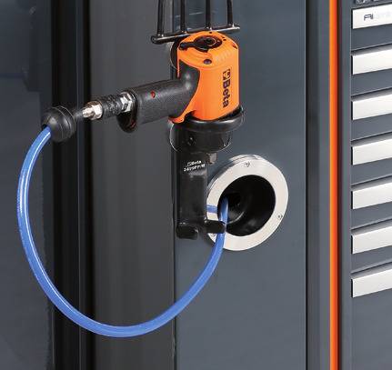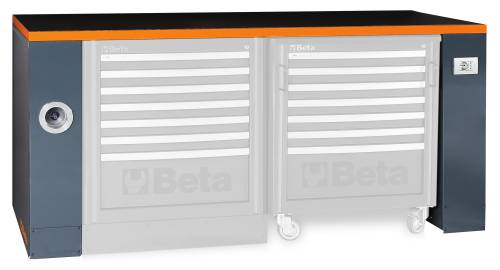Avec plan de travail revêtu d'une couche de PVC antichoc et anti rayures et résistante aux huiles et aux hydrocarbures. Trous pour l'installation d'un étau 1599P/150 - 1599GI/150 (non inclus). Pieds réglables en hauteur. Prises électriques (prise Schuko +16+10A et prise EU Plug 10A) et enrouleur intégré (prise pour air comprimé avec enrouleur intégré l de Ø 8 mm et de longueur 10m).