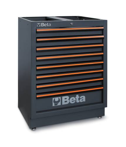 Tiroirs avec glissières à roulement à billes. Bases de tiroirs protégées par des tapis en caoutchouc moussé. Serrure centralisée avant. Avec pieds réglables verticalement. Peut être équipé de plateaux thermoformés.