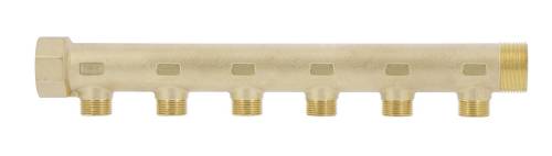 Collecteur de distribution en laiton pour réseau sanitaire, composable mâle-femelle, hexagone 6 pans, avec méplat de marquage, portée plate. Diamètre corps 39mm.