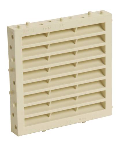Grille de façade avec moustiquaire. Avec ergots d'assemblage : dans chaque dimension, ces grilles peuvent s'additionner à elles-mêmes pour réaliser des surfaces de ventilation les plus diverses. Les ergots permettent en pourtour un scellement rapide et efficace.