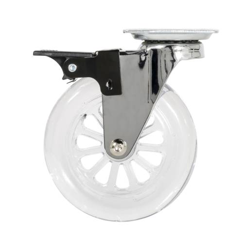 Roue en polyuréthane qui permet un roulage silencieux et une plus grande résistance dans la temps. Cependant les rayons du soleil peuvent jaunir la matière dans le temps.