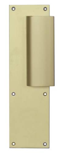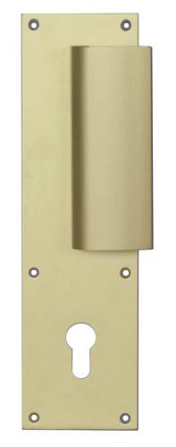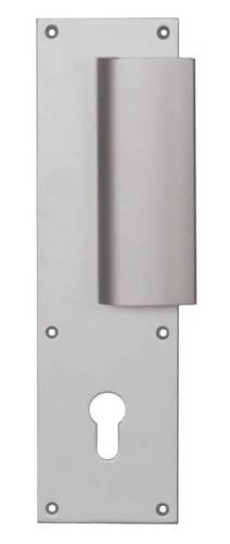 Poignée sur plaque pour porte palière en aluminium anodisé. Poignée réversible pour montage en simple ou en double, pour tous types de demi-ensembles et de serrures. Plaque percée fraisée 6 trous pour vis de 3mm, saillie de 36,5mm, hauteur poignée 120mm.