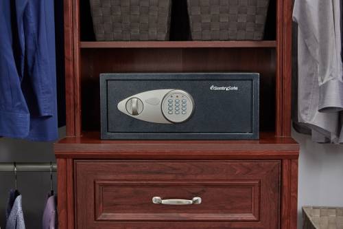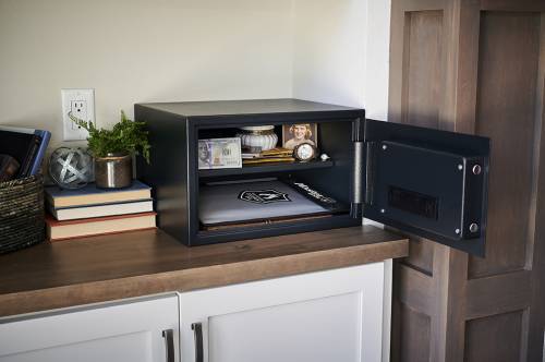 Coffre-fort à poser en acier massif. Le revêtement intérieur tapissé protège les biens contre les éraflures. Coffre fort à combinaison, verrouillage électronique.