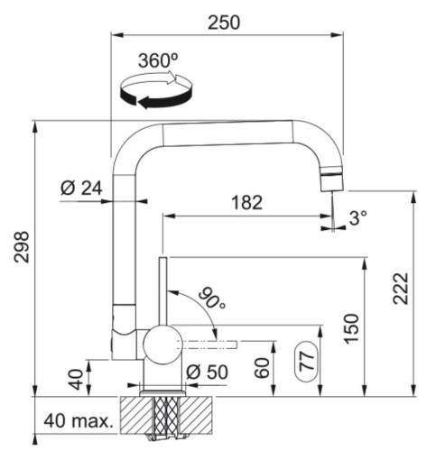 Mitigeur Window à bec rabattable spécial fenêtre (hauteur sous fenêtre minimum de 80mm). Type de cartouche céramique simple. Raccordement : Flexibles inox F12x17. Rotation du bec : 360°. Hauteur 298mm. Embase 50mm. Perçage 35mm.