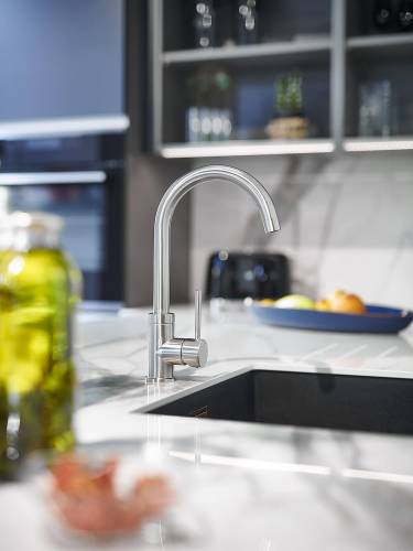 Corps laiton, poignée métallique. Bec haut mobile. Cartouche céramique Ø 35 mm. Aérateur mousseur F22. 2 flexibles d’alimentation inox F3/8''. Fixation facile sans outillage par vissage du pommeau. Garantie 5 ans.