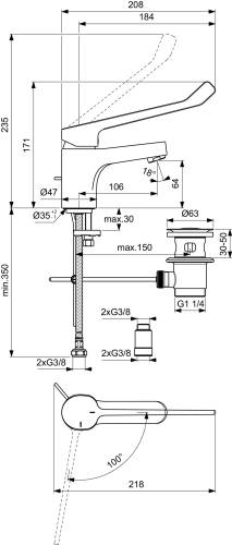 Bec fixe. Brise jet anti bactérien et anticalcaire fourni. Corps monobloc en laiton chromé. Limiteur de débit : 5L/min intégré à la cartouche. Ouverture en eau froide en position centrale : Technologie Blue Start. Tirette courbée en métal. Cartouche Firmaflow® Ø 38mm avec limiteur de température intégré. Indicateurs rouge/bleu imprimés sur la manette. Poignée Métal. Résiste aux choc thermiques jusqu'à 80°C pendant 60 min. Réducteur de bruit intégré. Système de fixation rapide EasyFix®. Flexibles d'alimentation anti-torsion : PEX 3/8" - 350mm. Hauteur sous aérateur 64mm, hauteur totale 171mm. Projection 106mm.