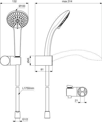 Set de douche composé d'un support articulé, d'une douchette (Ø 100mm, 3 jets (jet pluie, pluie concentrée et massage) et 6l/min) et d'un flexible anti-torsion de 1,75m. Nettoyage facile grâce aux picots en silicone anticalcaire.