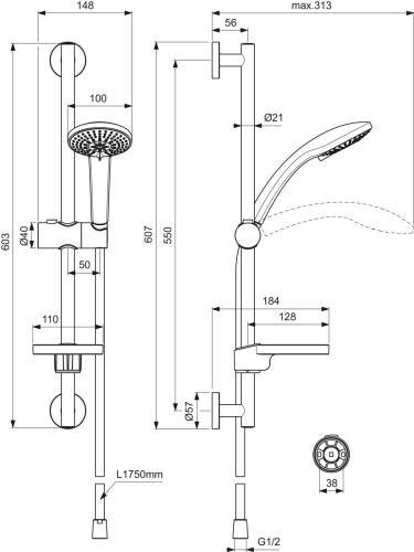 Set de douche composé d'une barre de 60cm, d'une douchette (Ø 100mm, 3 jets (jet pluie, pluie concentrée et massage) et 6l/min), d'un flexible anti-torsion de 1,75m et d'un porte-savon transparent. Nettoyage facile grâce aux picots en silicone anticalcaire.