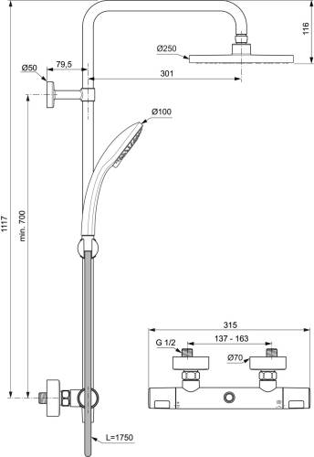 Douche de tête 250 mm. Débit 8 l/min. Douchette 100 mm 3 jets. Flexible anti-torsion 1,75 m. Inverseur dans la poignée, butées à 50 % du débit et à 40°C, corps tiède. Température maximum 50°C. Dimensions : 315x505.5x1117mm.