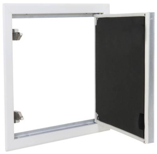 Tôle d’acier zinguée Z275, revêtement laqué blanc (RAL 9016). Loqueteaux cachés. Système d’ouverture : pousser/lâcher. Vantail décrochable. Montage rapide et simple. Fixation sécurisée par ancrages muraux.