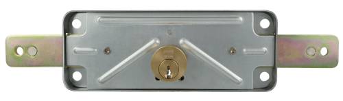 Serrure en métal pour la fermeture de l'obturateur. Actionnement extérieur et intérieur avec clé. Leviers latéraux en acier bichromaté (2 points de fermeture). Déplacement 24 mm avec un tour de clé. Coffre et couvercle en acier zingué. Cylindre rond avec 3 goupilles. Inclus 3 clés en laiton nickelé. Modèle 462/1 et 462/2 avec clés égales. Ébauche de clé modèle 4642.