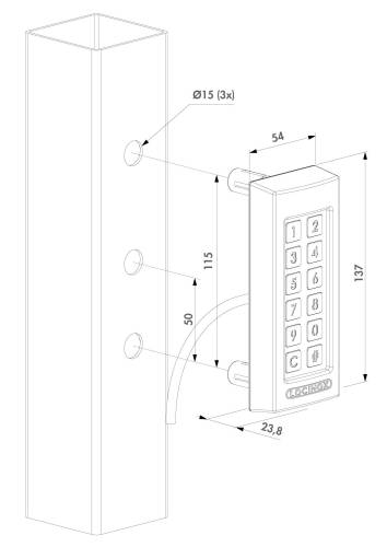 météorologiques, le contrôle d'accès est garanti. Les deux relais intégrés, la possibilité de raccordement en émission ou rupture permettent une connexion facile aux produits d'automatisation Locinox et tiers. Boîtier en aluminium anti-vandalisme avec laque texturée anti-rayures. Boutons-poussoirs en acier inoxydable très résistants testés pour 1 000 000 poussées et plus. Installation et configuration facile. Programmation facile de jusqu'à 100 codes d'utilisateurs.