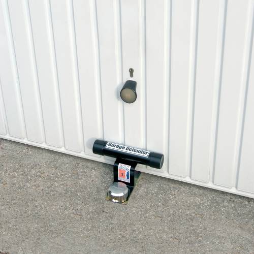 Cadenas sans anse en acier massif cémenté (diamètre de 71mm). Une barre s'encastre sur un socle en acier massif doté d'un cadenas. Montage simple au sol devant la porte du garage avec des boulons de sécurité extensibles. Installation sur une base en béton. Boulons de sécurité inclus.