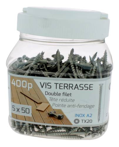 Vis terrasse double filet inox A2, avec tête réduite et pointe cutting. Pointe Cutting évite l’éclatement et la déformation du bois, pré-perçage nécessaire sur bois durs. Double-Filet: améliore le réglage et le maintien de la lame sur la lambourde. L’empreinte Torx 20 profonde offre encore plus de performance avec un meilleur maintient et une transmission plus efficace du couple de serrage.