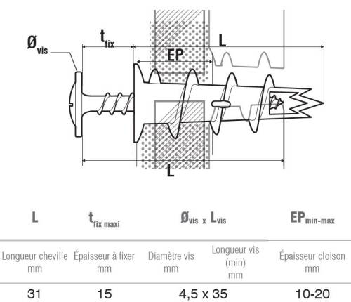 Pose rapide sans perçage préalable. Cheville monocorps pour des performances optimales. Idéal pose sur plaques de plâtre simple peau BA10, BA13 et BA15. Version Zamak résistante à la chaleur. Idéal pour la pose de chauffage, ventilation et air conditionné, matériel et accessoires électriques, matériel et accessoires de plomberie, éclairage mural, TV, étagéres et décoration.