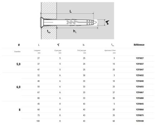 Conception permettant un excellent guidage du clou lors de la pose. Cheville prémontée pour une pose rapide. Clou en acier zingué. Clou fileté pour un démontage possible. Idéal dans le béton et la brique pleine et creuse.