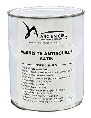 Vernis de finition satin pour métal à séchage rapide. Hautes performances. Bonne résistance aux intempéries. Excellent propriété anti- corrosion. Idéal sur surface neuve ou en entretien. A base de résine glycérophtalique modifiée uréthanne. À appliquer sur support sec avec un pulvérisateur en priorité sinon avec un pinceau large de type spalter ou bien au rouleau (trace possible). Nécessite 2 couches.