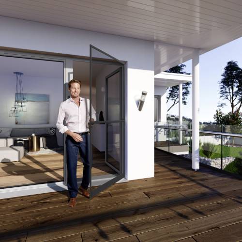 Porte-moustiquaire pratique offrant une protection fiable contre les insectes rampants et volants. Rail de poignée continu avec languette de poignée confortable et tôle de marche en aluminium. La porte se ferme d'elle-même grâce à des charnières et des aimants spéciaux.Stable et longue durée. Cadre en aluminium revêtu par poudre, toile en fibre de verre gris foncé pour une bonne visibilité vers l'extérieur, brosses d'étanchéité sur tout le pourtour pour une protection sans faille. Toutes les pièces peuvent être raccourcies.Elle s'ouvre vers l'extérieur. Idéal pour les portes de terrasse et de balcon à un seul battant. S'insère également entre le volet roulant et le cadre de la porte en raison de son faible encombrement de 16mm. Visser la porte-moustiquaire avec des charnières sur le cadre de la porte ou fixation sur un châssis de serrage (disponible en option) pour ne pas endommager le cadre de la porte.