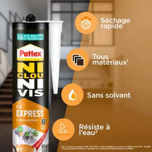 Permet la fixation d’éléments de grandes longueurs : plinthes, lambris bois et/ou PVC, baguettes, profilés métal ou PVC, tasseaux… en intérieur, en extérieur, en milieu humides (mais non adapté pour l’immersion totale), sur tous supports usuels du bâtiment. Convient pour les collages de plastique, de miroir, verre, métal, bois, briques, pierres naturelles, céramiques, béton, plâtre, tuiles... Séchage rapide 20 minutes. Repositionnable pendant quelques minutes. Sans retrait après polymérisation. Flexible. Ne se rétracte pas. Résiste aux UV, à la chaleur et à la vibration. Comble les jeux jusqu’à 20mm. Peut se peindre. Sans solvant, sans isocyanate.