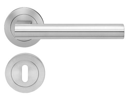 Diamètre de poignée 19 mm, rosace 52x10mm à trois pièces avec ressort de rappel. Fixation par vis traversantes M4, avec ergots de fixation. Ensemble comprenant deux béquilles et deux rosaces.