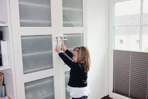Conçue pour les portes de placard avec des poignées de forme courante en étrier et se fixe entre les deux poignées en étrier sans coller, visser ou percer.