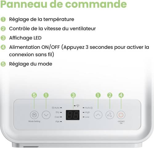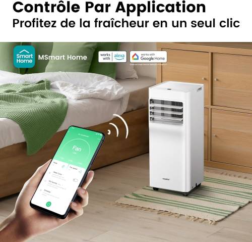 Climatiseur mobile 3 en 1 : Mode ventilation, déshumidificateur et refroidissement. Contrôle par panneau de commande (réglage température, 3 vitesses de ventilation, affichage LED ainsi que le mode) ou par l'application Msmart Home depuis votre smartphone et également compatible avec Alexa et Google Home. Minuterie 24H. Programmation horaire. Mode Auto. Grande mobilité grâce à ses poignées incorporées, ses roulettes pivotantes ainsi que ses dimensions réduites. Refroidissement rapide à l'aide d'un conduit d'air à quatre voie innovant, le flux d'air est de 326m³/heure, 40% plus fort que les modèles classique. Il vous apporte de la fraîcheur pour les journées estivales, idéal pour les pièces de 33m². Faible consommation, en mode de refroidissement, il ne consomme que 1200W par heure, à l'aide de compresseur à haute efficacité et le réfrigérant natural R290. Le mode veille consomme seulement 0,5W.