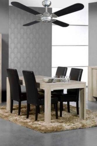 Ventilateur de plafond aux lignes moderne corps en acier chromé et 3 pales MDF bi faces couleur noir et argent. Owando est pensé pour être installé très facilement et en assurer un nettoyage également simplifié. C'est l'un des ventilateur les moins haut de sa catégorie, il est donc pratique pour être installé sur des plafonds "bas" environ 2,5 m. Moteur est fabriqué en acier Chromé et pales en MDF noir et argent sur l'autre face. Owando est doté de 3 vitesses permettant un réglage précis avec une consommation raisonnable de 50 W maximum et 3850 m3/h (13 à 25m²). 43 Db(a) en vitesse maximum. Il est contrôlé par boitier de commande mural fourni. Ventilateur avec fonction été / hiver ce qui en fait un vecteur d'amélioration de votre système de chauffage, dans le cas de plafond avec plus de 2,6 m de hauteur. Installation possible sur un plafond en pente à 30°.