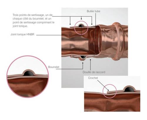 Solution innovante pour les raccords à sertir dans les applications de climatisation, de réfrigération et de pompes à chaleur Air-Eau (circuit fluide frigorigène). Avec une pression de service maximale de 48 bars et la technologie de connexion sans flamme, il est idéal pour une utilisation professionnelle. Accès facile aux chantiers, pas besoin de bouteilles de gaz. 3 points de sertissage, un de chaque côté du bourrelet, et un point de sertissage comprimant le joint torique. Cela fournit un raccordement permanent et sûr.