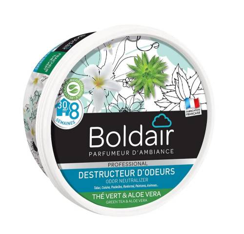 Boldair gel destructeur d’odeurs est un destructeur d’odeurs permanent sous forme de gel solide. Il ne masque pas les mauvaises odeurs mais les détruit radicalement. Fonctionne par évaporation de ses agents actifs naturels : ils entrent en contact avec les molécules malodorantes en suspension dans l’air et les détruisent. Grâce à sa grille de diffusion, le gel s’évapore de façon régulière ayant ainsi une efficacité permanente et durable (jusqu’à 8 semaines). Il est efficace sur toutes les mauvaises odeurs : tabac, cuisine, poubelles, toilettes, moisissures, renfermé, animaux, peinture… Non toxique et biodégradable, il ne dégage pas de gaz. S’utilise partout ou les odeurs persistent : maison, voiture, bureau, vestiaires, collectivités…