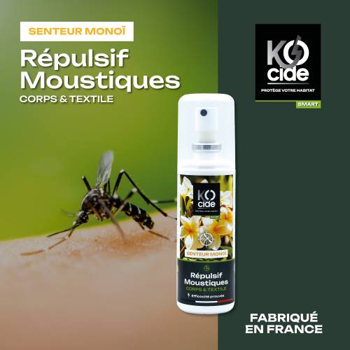 Le répulsif moustiques K-OCIDE est un produit efficace contre les insectes piqueurs tels que les moustiques, les taons, les puces et les tiques. Il offre une protection durable jusqu'à 6 heures et laisse un parfum exotique de monoi, idéal pour vos voyages ou sorties estivales. Convient aux enfants à partir de 1 an.