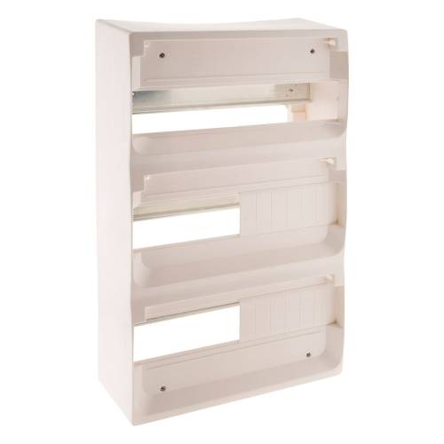 Tableaux de répartition à équiper. Rails amovibles. Livrés avec porte étiquette, étiquettes et borniers. Montage en saillie. Température d’utilisation : - 5°C à + 60°C. Norme NF EN 60670-1. Indice de protection : IP30.