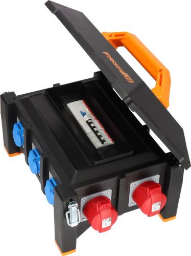 Coffret de chantier conçu pour une utilisation en extérieur, 2m de câble néoprène (H07RN-F 5G2,5) résistant aux hydrocarbures, boîtier protégé contre les projections d'eau de toutes directions (IP44). Coffret doté de: 1 bouton d'arrêt d'urgence, 1 interrupteur différentiel 30mA (230/415V 25A 4 pôles Type AC), disjoncteurs divisionnaires (1x16A/415V 4 pôles Courbe C + 3x16A/230V 2 pôles Courbe C), 2 prises de courant 3P+N+T 16A/415V, 6 prises de courant 2P+T 16A/230V avec clapets à fermeture automatique et 1 fiche 3P+N+T 16A/415V. Coffret électrique développé avec un mélange de plastique/élastomère pour un usage professionnel et résistant aux conditions sur chantier difficiles de -30°C à +80°C (en extérieur comme en intérieur).