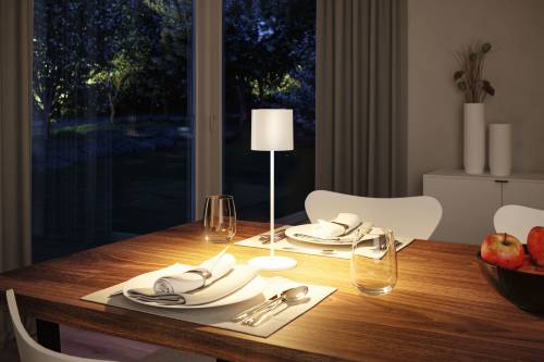 La lampe à poser LED mobile à batterie Tuni avec IP44 en Blanc dépoli avec ses dimensions de est compacte et maniable. Elle ne nécessite aucun branchement électrique et peut être utilisée individuellement à l'intérieur comme à l'extérieur. Que ce soit au Camping, sur la terrasse ou le balcon, au restaurant ou dans le salon – cette lampe à poser à batterie est utilisable partout. Son design réduit et intemporel permet une utilisation universelle et flexible. Elle crée en outre une agréable ambiance lumineuse blanc chaud et convainc par ses matériaux et sa finition de haute qualité, qui lui confèrent une longue durée de vie. Le temps de charge court de 5 à 6 heures permet une longue durée d'éclairage jusqu'à 10 heures à pleine luminosité (100 %). La lampe à poser à batterie peut être rechargée via le port USB-C et dispose d'une fonction de variation d'intensité en continu tactile.
