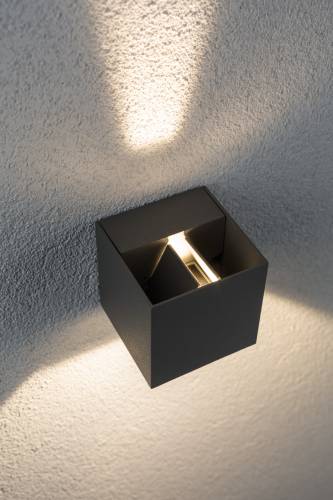La lumière ne doit pas toujours venir d'en haut : l'applique Cybo crée des effets de lumière stylés sur les façades et dans les entrées et assure ainsi une meilleure orientation dans tout autour de la maison. Vers le haut ou vers le bas, la restitution de la lumière œuvre en toute flexibilité. Grâce à un mécanisme de pliage, l'angle de rayonnement des deux cônes de lumière se règle de manière personnalisée. Luminaire individuel module LED inclus. Dimensions : 80x80mm. Température de couleur 2700K.