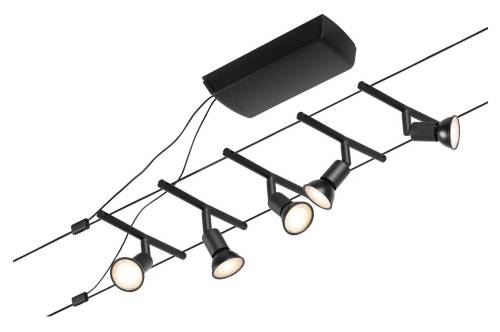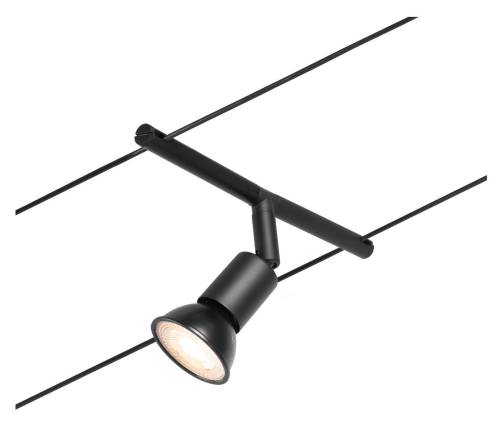 La gamme Salt s'installe aussi bien sur un mur qu'au plafond et offre des possibilités d'aménagement illimitées. Matière métal et plastique. Droites, pentues ou resserrées – les systèmes câbles s'intègrent dans toutes les pièces et résolvent les problèmes d'installation. Personnalisable, le kit de base se complète avec des spots individuels, des renvois d'angles et autres accessoires. Le câble d'une longueur de 10 m peut être divisé au milieu pour que le système soit tendu sur max. 5 m. Ce système permet une diffusion de la lumière optimale et peut être facilement étendu en cas de besoin d'éclairage plus élevé. Une seule prise électrique est nécessaire pour la répartition des luminaires dans l'ensemble de la pièce. Les systèmes dotés de la technique 12 V CC (courant continu) ne sont pas gradables via un variateur mural. Classe de protection II. Vendu sans ampoule.