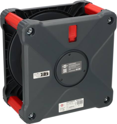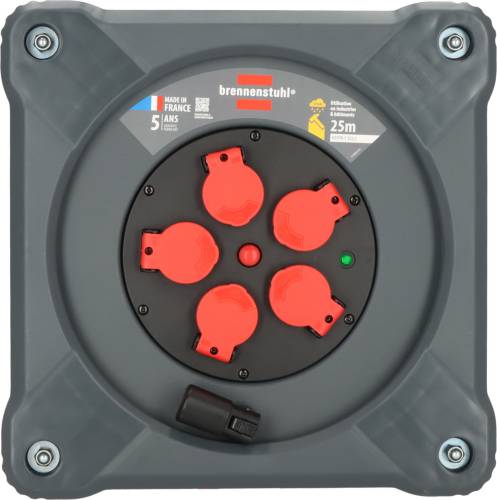 Enrouleur électrique équipé de câble H07RN-F 3G2,5 résistant aux hydrocarbures. Structure du boîtier développée en forme cubique offrant une protection renforcée contre le retournement. Dérouleur électrique muni d'un bouton manivelle rabattable, extrêmement robuste, adapté à un usage en intérieur et en extérieur - sur chantier (échafaudage, toit, etc) ou en atelier. Enrouleur de câble avec 5 prises de courant 2P+T 16A/230V avec clapets à fermeture automatique, un disjoncteur thermique central et un voyant de présence de tension évitant les déplacements inutiles. Dévidoir de câble avec un matériau de la structure (boîtier et tambour) fabriquée dans un mélange composé de plastique et de caoutchouc particulièrement résistant aux chocs, aux impacts et au froid. Enrouleur de câble extérieur avec frein de tambour pour bloquer le câble durant le transport, trous de rangement de la fiche et 4 poignées de transport avec guidage du câble prévu sur les 4 côtés. IP44.