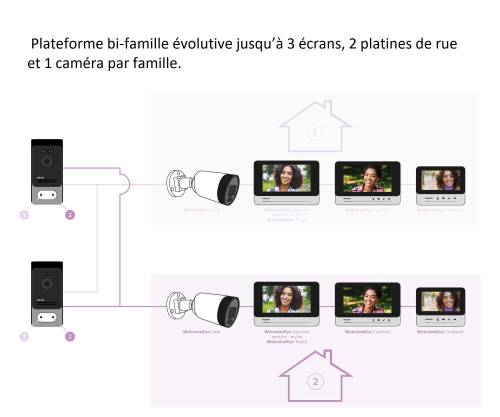 * Plateforme bi-famille évolutive jusqu'à 3 écrans, 2 platines de rue et 1 caméra par famille.