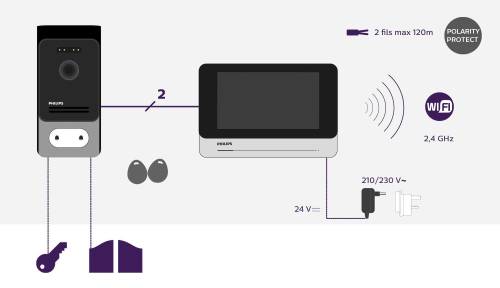 Design soigné, écran tactile couleur 7'' ultra plat, le visiophone Philips WelcomeEye Connect 2 est un produit facile à vivre. Relié par 2 fils avec sa platine de rue, ce visiophone deviendra un véritable accessoire incontournable de votre quotidien. Effleurez son écran tactile et accédez à ses différentes fonctionnalités : visualiser et dialoguer avec vos visiteurs, piloter l'ouverture d'un portillon ou d'un portail motorisé... Vous pouvez commander l'ouverture d'un portillon via les badges RFID mais aussi visualiser vos visiteurs à distance via votre Smartphone. En cas d'absence, WelcomeEye Connect 2 enregistre les images de vos visiteurs. IP 44. La vision nocturne va jusqu'à 2.5 mètres.