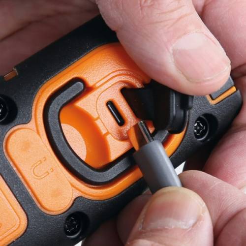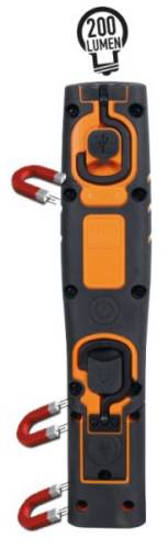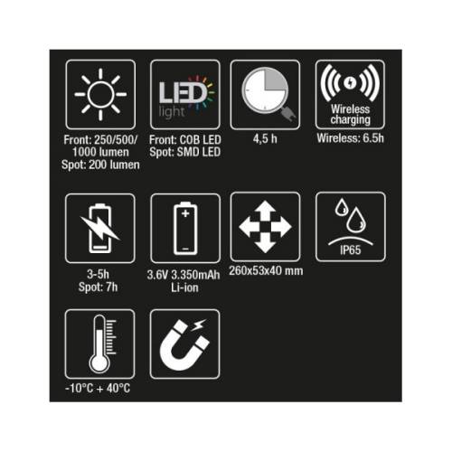 en tête (spot) : LED SMD, 200 lumens. Batterie rechargeable Li-ion 3.6V 3.350mAh. 2 modes de charge : base sans fil 1839BRW ou alimentateur avec connexion USB-C.Temps de charge : 6.5h avec base de recharge sans fil ou 4.5h avec alimentateur. Autonomie: avant : 3-5h ou en tête (spot) : 7h. Indicateur de charge de la batterie à 3 LEDs. Base orientable à 180°. Corps en caoutchouc antiglisse. Double crochet orientable. Aimants sur base et sur derrière. IP65. IK07.