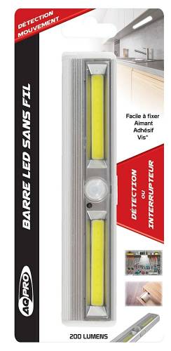 Barre LED en aluminium et en plastique ABS équipée d'un détecteur de mouvement pour un allumage instantané et automatique. Grâce à son flux lumineux de 200 lumens et son indépendance du réseau électrique, elle est idéale pour éclairer une zone en toute autonomie. Elle dispose de deux LED COB pour un éclairage puissant et uniforme de couleur blanc froid. Un interrupteur est également présent afin de régler l'allumage et l'extinction de manière manuelle. Plusieurs modes de fixation sont disponibles : magnétique grâce à un aimant puissant situé au dos de la barre LED, par vis grâce aux 2 coches à l'arrière de l'appareil (vis non fournies), adhésif/scratch par double adhésif avec scratch permettant de retirer le produit pour remplacer les piles.