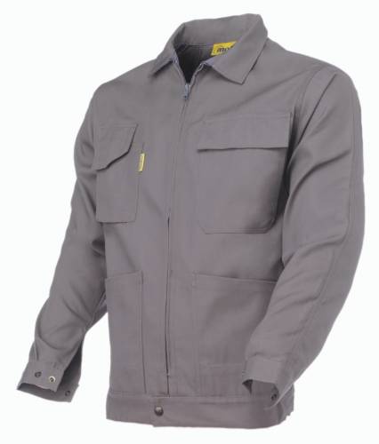 Blouson croisé 2/2, 60% coton, 40% polyester, 315g/m². Col cheminée. Emmanchures raglan dos. Poignets rapportés réglables par 1 pression plastique à calotte double positionnement. 1 pince coude. 1 poche poitrine devant droit à soufflet, rabat fermé par un ruban auto-agrippant. Poche comportant un compartiment crayon. 1 poche poitrine devant gauche plaquée, rabat fermé par un ruban auto-agrippant. 2 poches basses plaquées, ouvertures obliques. Fermeture milieu devant par glissière sous lèvres. Ceinture rapportée élastiquée sur les côtés. Boutons pressions plastiques et fermeture à glissière spiralée avec curseur plastique.
