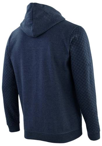 Tissu principal: Molleton gratté - 290g/m² - toucher peau de peche - 60% coton 40% polyester, doublure capuche jersey 100% coton 160g/m². Poche zippée sur poitrine. 2 poches côté fermées par pression en bas. Capuche doublée en jersey. Molleton gratté aspect peau de pèche. Bords côtes en bas et bas de manches. Larges cordons de serrage capuche en coton, embouts et oeillets gravés, finition métal. Plaque métal gravée « PULS with M » sur manche gauche. Zip métal pour un look authentique. Finition aspect matelassé sur manches. Bande de propreté encolure contrastée. Patte intérieure de protection le long du zip.