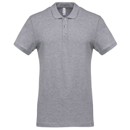 Confection 100% coton piqué prérétréci 180g/m² (gris chiné 90% coton, 10% viscose). Coupe droite. Col et bas de manches en bord-côte 1x1. Patte de boutonnage col 3 boutons ton sur ton. Bande de propreté ton sur ton à l'encolure. Certifié STANDARD 100 by OEKO-TEX®.