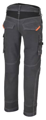 T/C Canvas, 65 % polyester, 35 % coton, 260 g/m². Poches pour genouillères et bas de jambe renforcés en polyester 600D. Entrejambe antidéchirure. Taille plus haute sur la partie arrière pour une meilleure protection du dos. Empiècement arrière élastifié pour faciliter les mouvements. Taille élastifiée sur les côtés. Deux grandes poches avant, une munie de pochette. Deux pochés arrière avec fermeture à pression. Grandes poches latérales avec fermeture à pression, une munie de porte-badge. Anneau porte-clés à la taille. Passant pour marteau.