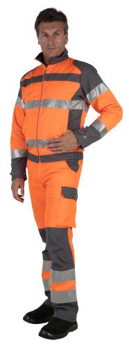 Matière fluo 55% coton, 45% polyester satin 300g/m². Matière de contraste 65% coton, 35% polyester 300g/m². Bandes rétro grise largeur 70mm. Ceinture 5 passants fermée par bouton célibataire, élastiquée côtés. Anneau plastique à la taille. Braguette zip spirale. 2 poches italiennes. 1 poche cuisse gauche, 2 soufflets rabat velcro. Poche mètre. Poche arrière invisible. Pinces d'aisance aux genoux.
