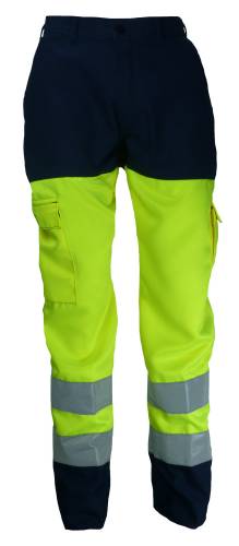 Tissus fluorescent 80% polyester, 20% coton, 280g/m², tissu de contraste 60% coton, 40% polyester, 310g/m². Ceinture élastiquée, dos réglable, braguette zip, 2 poches italiennes, 1 poche plaquée jambe droite avec rabat velcro, 1 poche smartphone (9x17cm) sur jambe gauche, 1 poche arrière. Entrejambe 82cm + ourlet de 5cm.