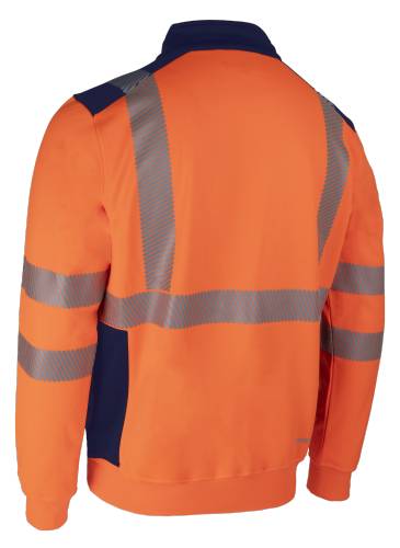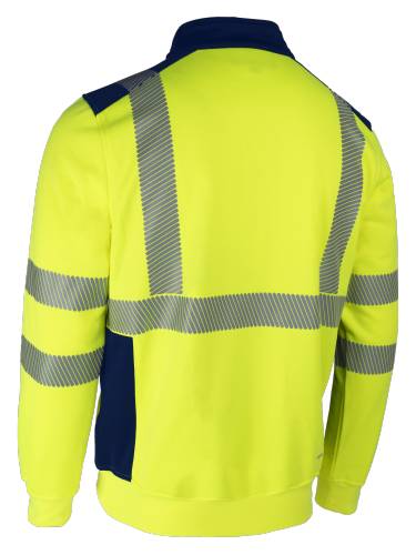 Sweat haute visibilité maille grattée envers molleton 75% polyester, 25% coton - 300g/m², bord-côte 95% polyester, 5% élasthanne. Bandes rétro-réfléchissantes segmentées microbilles 5cm, 2 épaules, 1 ceinture, 2 brassards/manche. Col montant zippé, ceinture et poignets bord-côtes, renforts empiècements contrastés col, épaules, côtés et poignets. 1/2 zip pour faciliter l'enfilage.