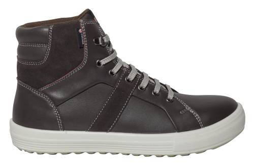 Sneakers montantes de sécurité. Design inspiré de celui des sneakers grand public. Chaussures réputées pour être ultra-confortables. Tige bi-matière avec bande de cuir velours pour un style plus urbain. Dessus cuir pleine fleur + microfibre. Doublure textile. Embout acier. Semelle intérieure maille sur mousse en EVA, amovible. Semelle antiperforation non métallique. Semelle polyuréthane bi-densité. Le design de la semelle maintient l'arc naturel du pied pour plus de confort et moins de fatigue en position debout.